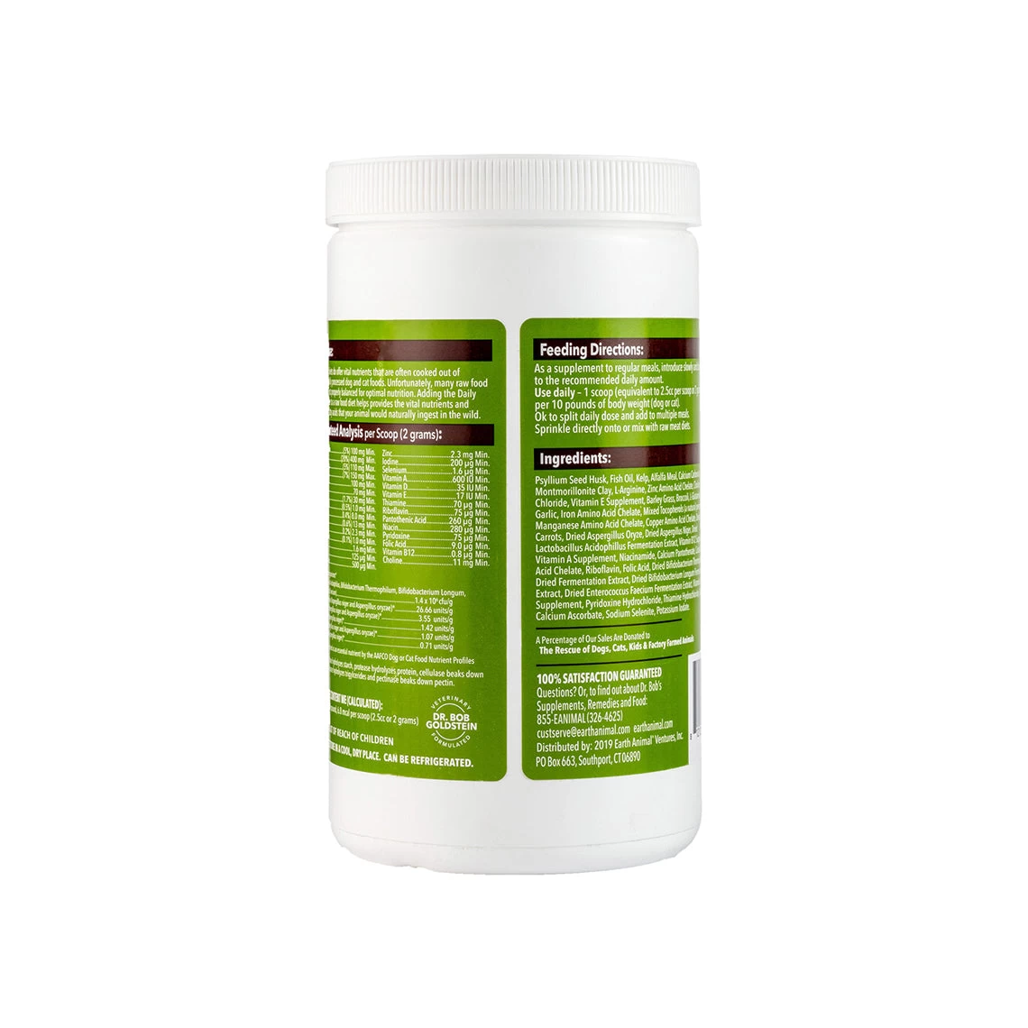 Earth Animal Daily Raw Food Nutritional Supplement Powder is an all-in-one multivitamin plus mineral supplement to add to raw food diets. It contains essential fatty acids, vitamins, minerals, digestive enzymes, probiotics, & high levels of Vitamin E that will give the nutrients necessary when feeding raw food. Dr. Bob Goldstein formulated this well rounded supplement with his 40 years of veterinary experience.Â