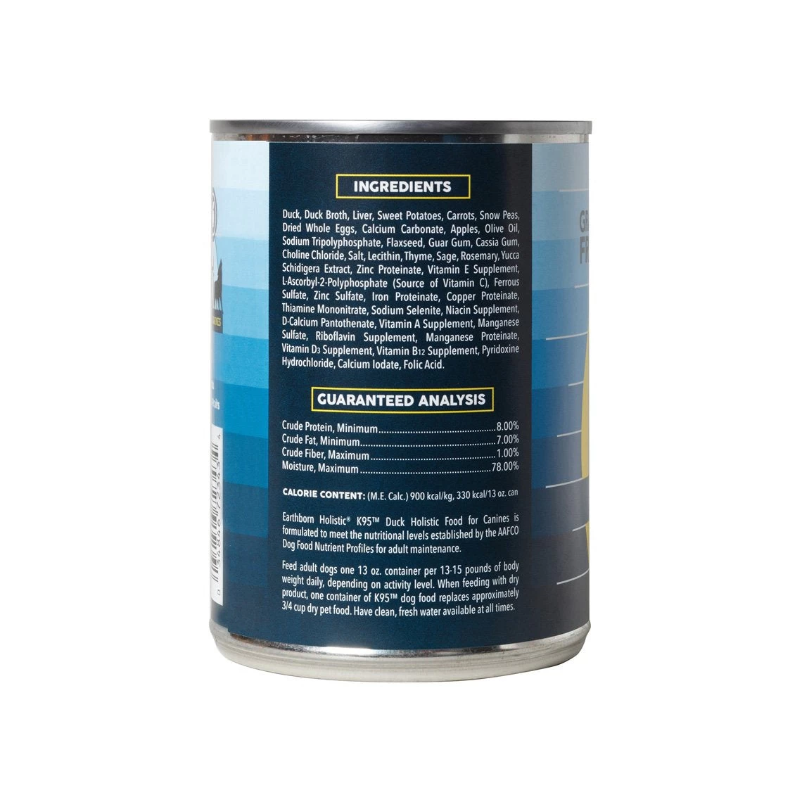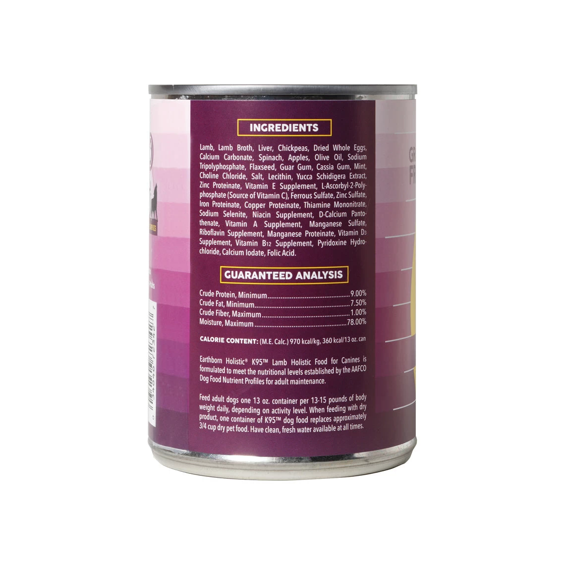 Earthborn Holistic K95 Canned Dog Food features recipes made with 95% real meat and only 5% farm raised fruits and vegetables. Each recipe is grain free, gluten free and rich in nutrients.
