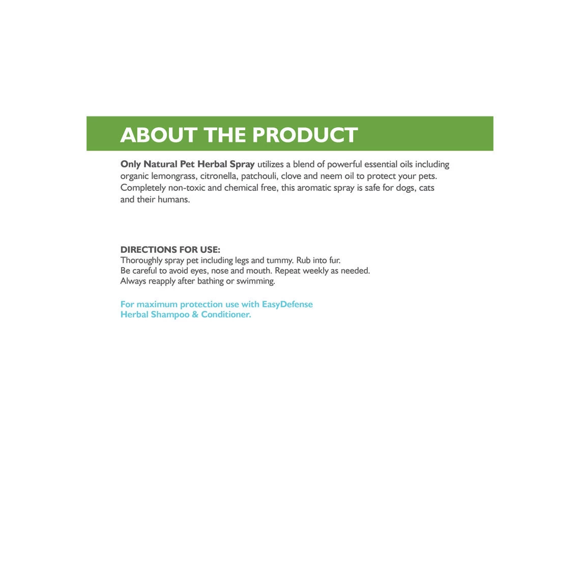 Only Natural Pet EasyDefense Herbal Spray is an essential oil based insect repellent for both dogs and cats. Featuring insect fighting essential oils, like organic lemongrass, citronella, patchouli, clove, and neem oil, this spray is aromatic for us and our pets, but signals biting insects to keep away.