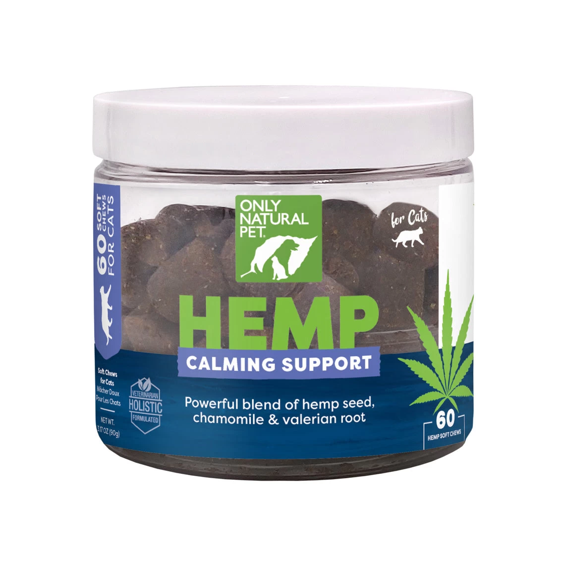 Only Natural Pet Hemp Calming Supplement soft chews for cats naturally help cats cope with external stresses such as car rides, vet visits or changes to daily routine or environment. They feature a holistic combination of hemp seed oil, chamomile, valerian and passion flower.