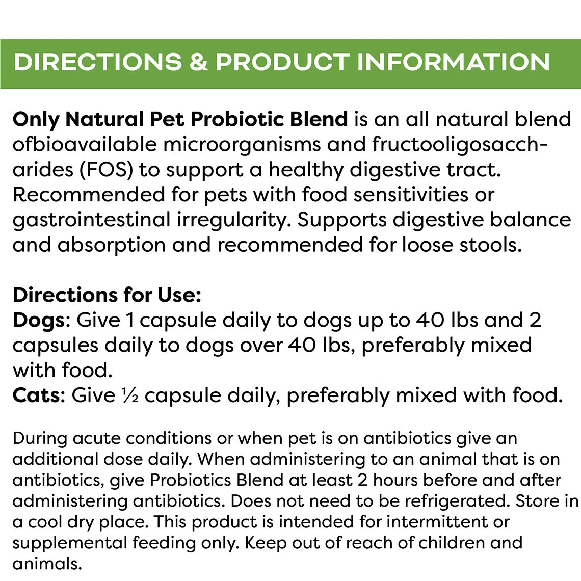 Only Natural Pet Probiotic Blend contributes to the health and balance of your pet’s intestinal tract by supplying natural microorganisms and prebiotics that support a healthy digestive tract and aid in nutrient absorption. This formula is a multi-strain combination of bio-available microorganisms in a prebiotic base of fructooligosaccharide (FOS). Manufactured to ensure maximum potency and stability at room temperature.